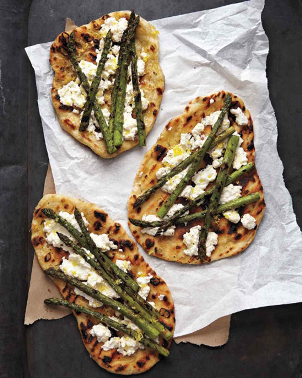 Heat it up: Set up a grill with heat source, coals or gas, on one side over medium-high. Clean and lightly oil hot grill. Stretch it: On a lightly floured work surface, stretch 4 ounces’ store-bought dough into a 10-inch-long oval or other desired shape. Brush one side lightly with Herb Oil or olive oil and season with salt and pepper. Grill it: Using your hands, place dough, oiled side down, directly over heat source. Brush dough with herb oil or olive oil and cook until underside is lightly charred and bubbles form all over top, 1 to 2 minutes. With tongs, flip dough and cook until lightly charred, 1 to 2 minutes. Slide dough to cooler side of grill. Top it: Top with ricotta cheese, lemon zest and asparagus; cover grill. Cook until cheese melts and toppings are heated through, 2 to 5 minutes. Drizzle with herb oil before serving.[print-me target=".post-content"]