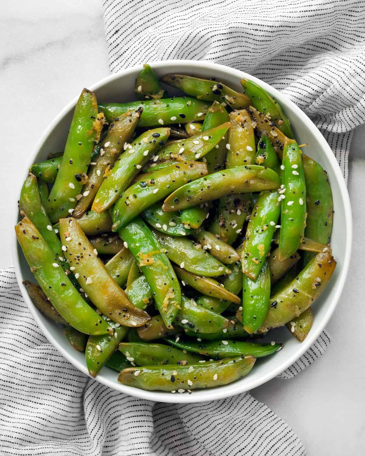 1 tablespoon olive oil1 pound sugar snap peasJuice and zest of 1 lemon1/2 teaspoon kosher salt1/4 teaspoon black pepper1 tablespoon everything seasoningCook Mode Prevent your screen from going dark INSTRUCTIONSHeat the oil in a large skillet over high heat.Add the snap peas and lemon juice. Sauté for 3-5 minutes until bright green and tender but crisp. Some will be lightly browned.Stir in lemon zest, salt and pepper.Finish with everything seasoning.If you want to flavor them with something other than everything seasoning, keep the lemon, salt and pepper and try one of these ideas:Red pepper flakes add spicy heat.Butter: Stir in a knob of butter at the end of sautéing.Garlic: Add one minced garlic clove in the final 30 seconds of sautéing.Parmesan cheese: Sprinkle them with finely grated Parmesan for a final garnish.Store leftovers in an airtight container in the refrigerator up to 3 days. Eat them cold or quickly warm them in a skillet over medium heat.