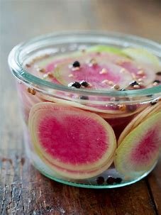 Wash your watermelon radishes well, making sure to remove any dirt. Using a mandoline or a sharp knife, thinly slice your watermelon radishes into discs, then place in a clean canning jar.In a non-reactive saucepan, bring the water, vinegar, salt, and sugar to a boil, and simmer for one minute or until the sugar and salt are dissolved. Remove from heat and add the garlic and peppercorns. Pour the hot liquid including the garlic and peppercorns over the radishes.Let cool to room temperature, then cover and refrigerate.